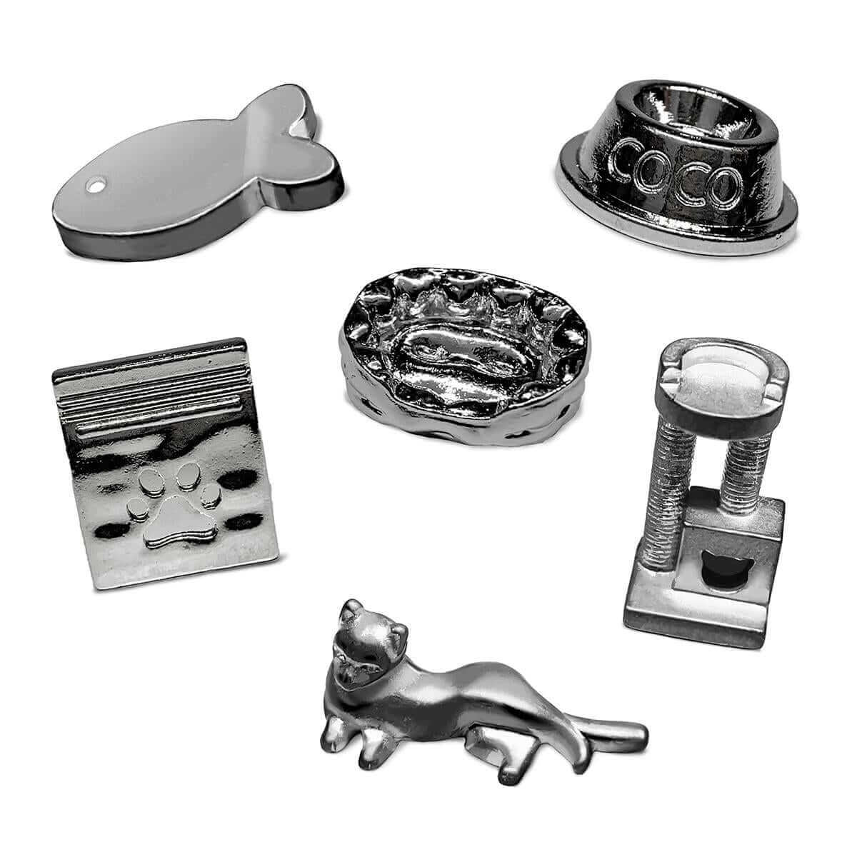 - Includes 6 metal tokens including a bowl, bed, treat box, fish treat, cat and scratching post, and household locations like the office, kitchen and living room