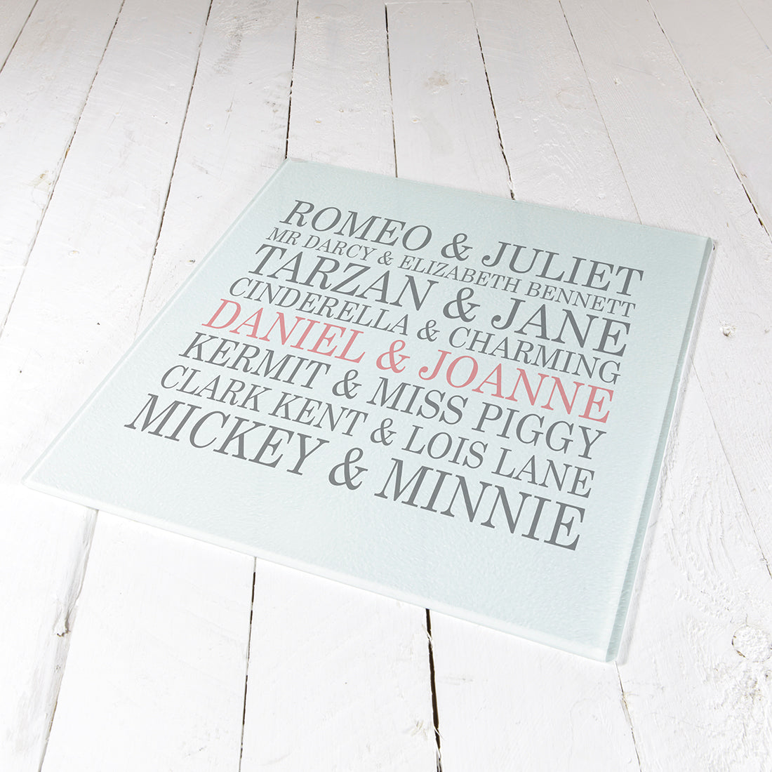 Add a touch of personalisation to your kitchen with this beautiful glass chopping board. Featuring your names and a special date, this board is both practical and stylish.