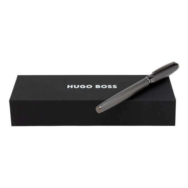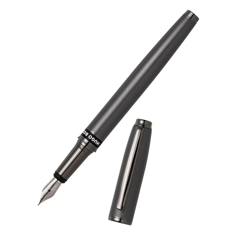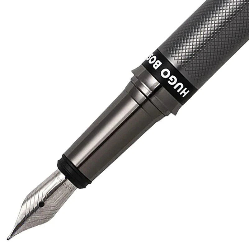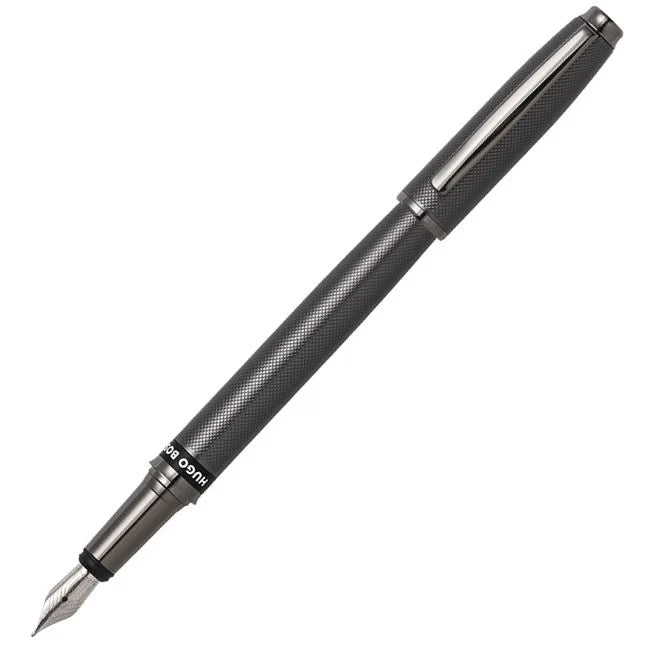 The Hugo Boss Stream fountain pen stands out initially with the Hugo Boss wording printed around the tip of the barrel which follows by a very fine criss-cross effect giving this pen a nice traction for you to grip on to. The gun metal colouring on the pen follows through until you reach the chrome tip which comes with a delicate chevron detailing.