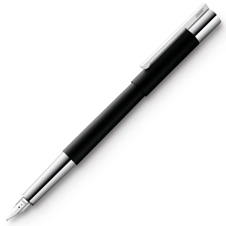 This Lamy Scala Black Fountain pen has a matte black body that is contrasted by a polished steel nib, clips and trims.