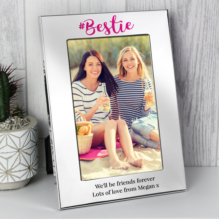 Celebrate your best friend with this elegant Personalised "Bestie" Photo Frame. This beautiful silver frame is the perfect way to display a cherished 4x6 photo of a special memory. The classic design, along with the fixed text "Bestie", makes it a timeless gift. You can make it truly one-of-a-kind by adding a personal message over two lines of text (up to 25 characters per line).