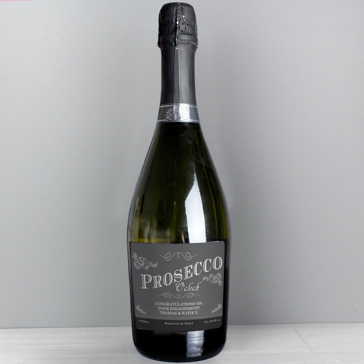 Pop the cork and raise a glass to special occasions with this personalised Prosecco bottle. Featuring the words "PROSECCO O'clock" and three lines of customisable text (up to 30 characters per line), it's the perfect way to add a personal touch to any celebration.