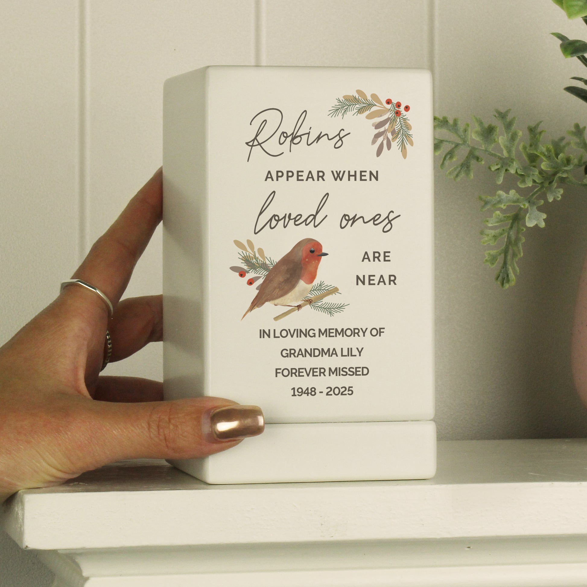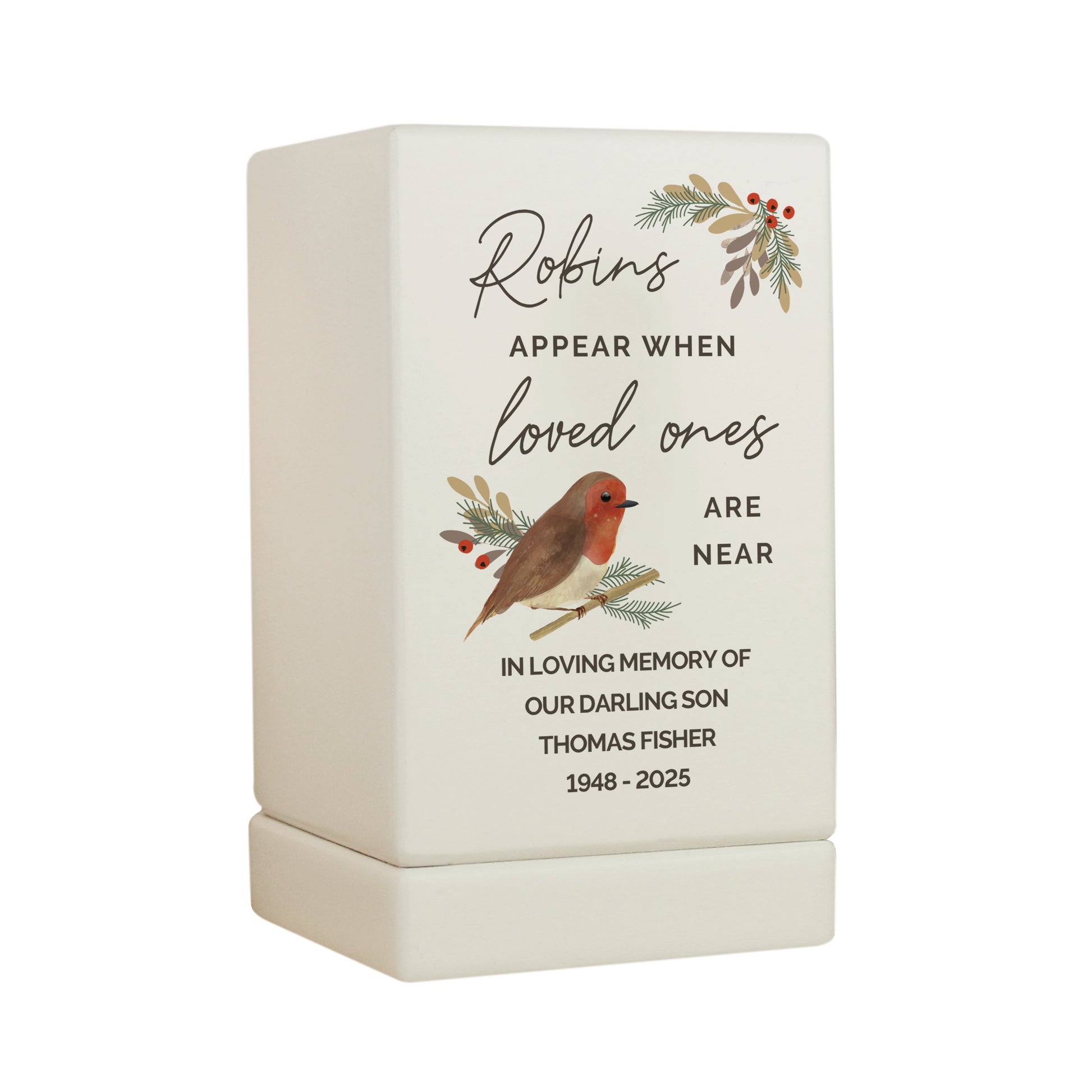 Our Personalised Robins Appear Small Wooden Urn is a beautiful tribute to a loved one. This high-quality wooden urn features a fixed robin design and the message "Robins appear when loved ones are near."