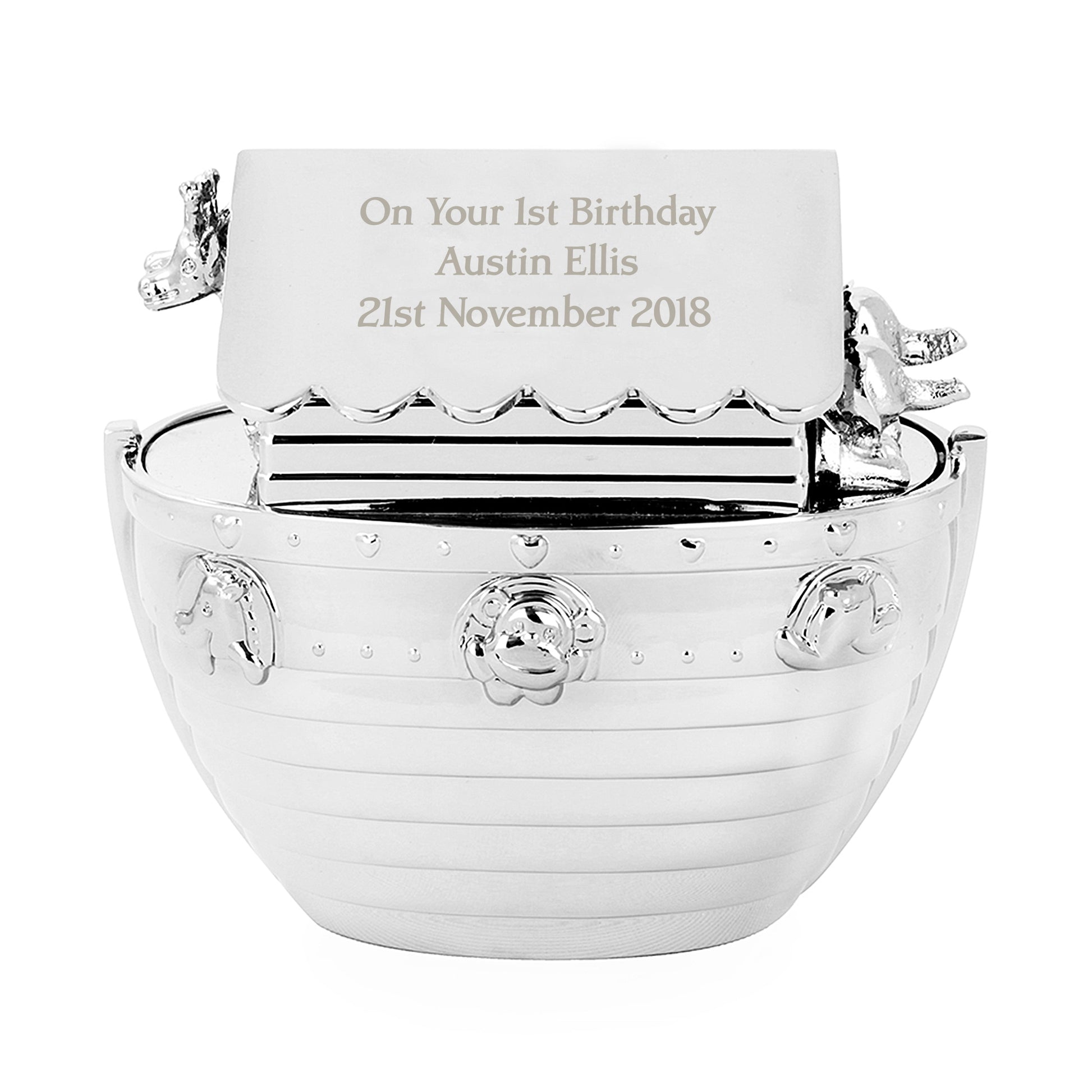 Celebrate a special occasion with this adorable silver-plated Noah's Ark money box. Customise it with a personalised message over three lines (20 characters per line) to create a truly unique and meaningful gift.