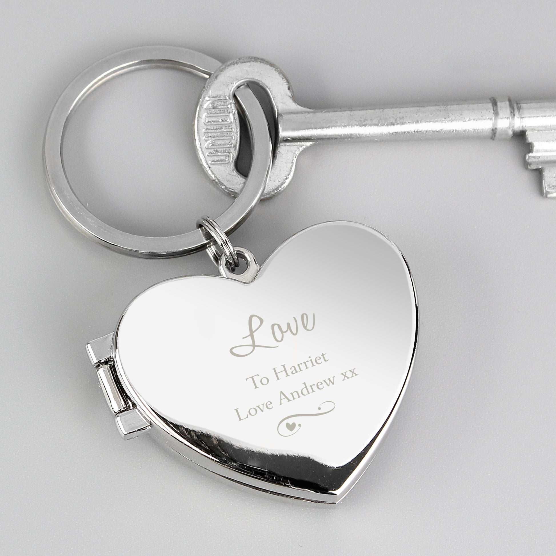 Show that special someone how much you care with this beautiful Personalised Swirl Heart Photo Keyring. This nickel-plated keyring is the perfect way to keep a cherished memory close at hand. With a graceful swirl heart design, you can make it truly one-of-a-kind with a personalised name (up to 12 characters) and a custom two-line message (up to 20 characters per line).